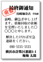 に始まって丁寧っぽい文章ながら「借金を返さなければ自宅や仕事先、親類にも迷惑がかかるし押しかけますよ!」という要するに脅しの内容なんです。