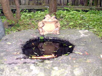 緑に囲まれた中でのスズメの水浴びは、涼をくれる夏の風情。