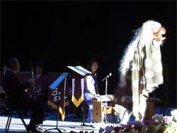 客席後方からの獅子舞の登場で始まり、獅子舞のコミカルな動きとお客様とのコミュニケーションが笑顔を誘い、楽しい開幕でした。 獅子は舞いながらステージ上へ・・・。 獅子舞が舞台袖に下がると同時に吹奏楽をバックに吹奏楽部監督・村田元久先生のオーボエと筝による「春の海」。 まさに「お正月!」でした。