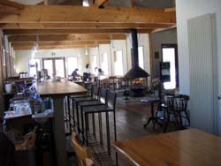 下:天井は吹き抜けになっていて、大きな梁が見えます。かっこいい薪ストーブも置いてありました。